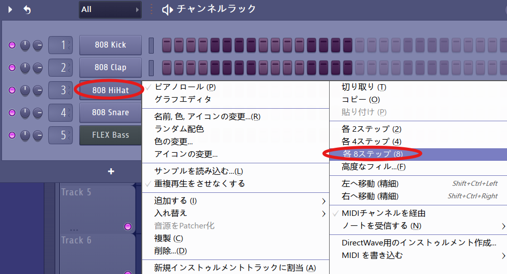 FL Studioではchannel rackを右クリックすると8分で打ち込んでくれるショートカットがでてきます。